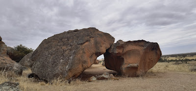 Ein paar Granitfelsen warteten heute auf mich. Fast wie am Uluru, nur dass die Felsen kleiner waren. Und an einem Felsen der hier aus der Erde herausragt hat man Abbruch betrieben. Riesige Felsklötze liegen hier noch herum die offensichtlich keiner mehr abholt. Ich finde das schon spannend, ein Felsen hat eine Länge von ca 1 km und rundherum gibt es riesige Kornfelder. Folglich ist hier ja nicht alles Granit sondern der Großteil mit fruchtbarem Boden bedeckt. Lt. Anzeigentafel waren hier auch die Aboriginel People (so müssen sie heute bezeichnet werden) vor langer Zeit weil es hier Wasser gab bzw. noch gibt. Das hatte sich in den Auswaschungen der Felsen gesammelt nach den Regenfällen.